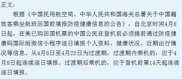時間:自北京時間4月8日至4月22日,想要從美國回國的人員,需要提供自4月8日起填報的《防疫健康碼國際版》。4月22日之后想要從美國回國的人員,需要提供登機日期前,連續14天的填報記錄。
